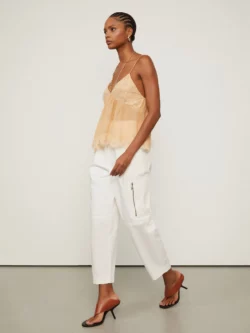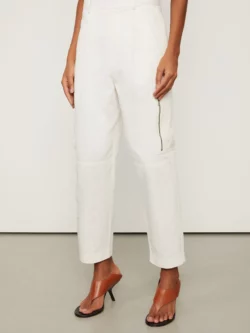 A Calça Cargo Off White possui cintura alta, passantes no cós, bolsos laterais e nas pernas com fechamento por zíper, bolso faca nas costas, recortes nos joelhos, pregas frontais e passadores com fechamento interno na cintura. Uma peça versátil para composições modernas. Complementos delicados e femininos adicionam leveza e sofisticação à produção. Detalhes: – Cintura alta; – Modelagem de carga; -Forro nos bolsos; – Bolsos importantes nas laterais – Bolsos com zíper nas pernas; – Bolso faca nas costas; – Prégas frontais; – Passantes no cós; – Fechamento interno.