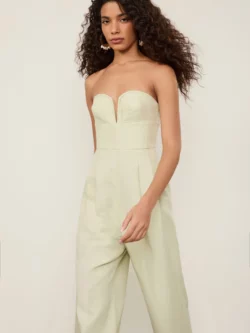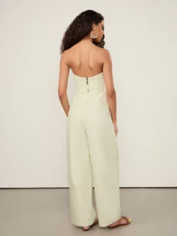 Macacão Liso de Algodão com top corset sem alças, fechamento por zíper nas costas, detalhes de pregas frontais e bolsos. O modelo compõe a alfaiataria contemporânea e elegante da coleção.