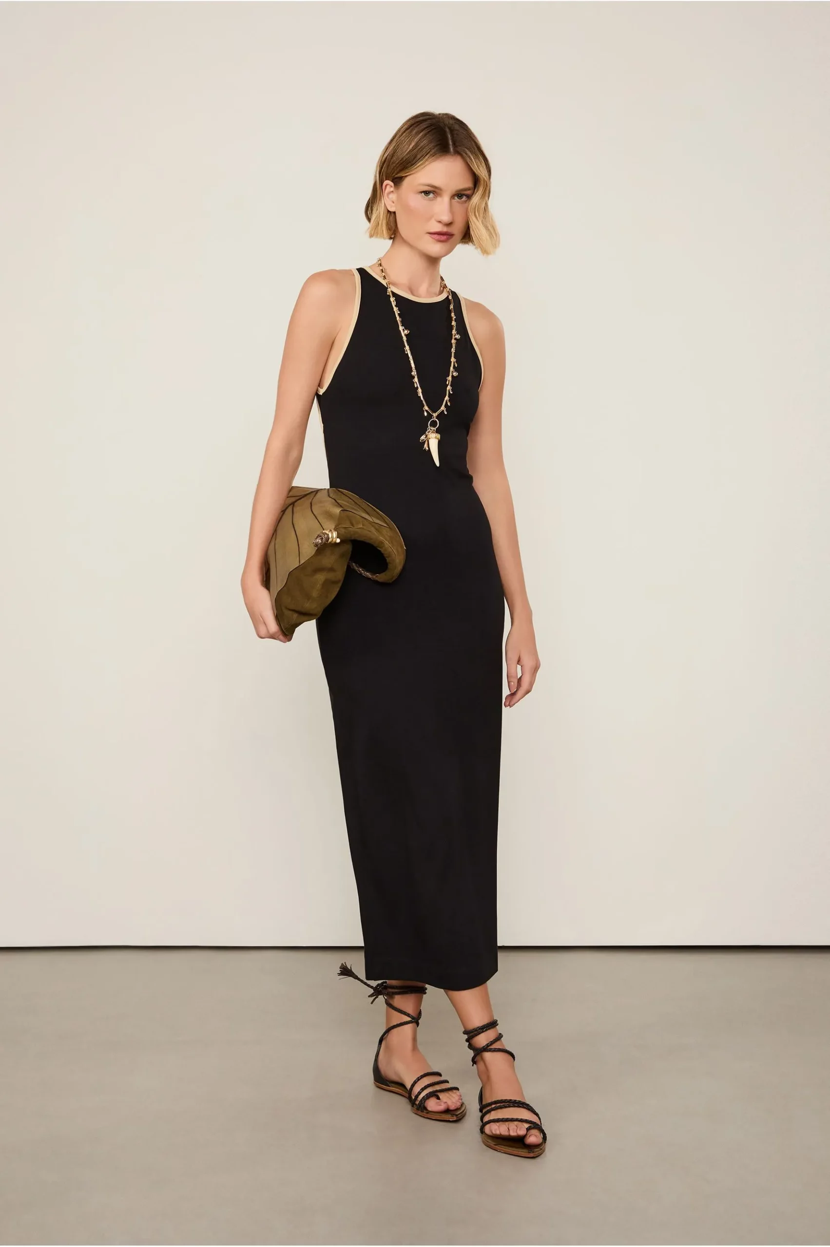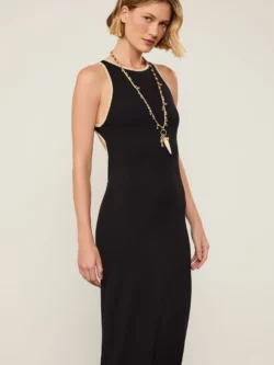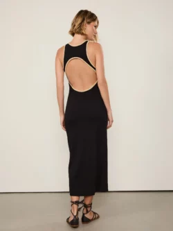 Vestido Liso de Malha com decote nadador, comprimento midi, shape reto e gola redonda. Como detalhes especiais, possui recorte vazado nas costas e vivo bicolor nos acabamentos. Perfeito para composições contemporâneas e versáteis.