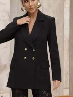 Os botões dourados duplos e o fechamento transpassado trazem um charme refinado, enquanto o tecido com elastano proporciona conforto ao vestir.