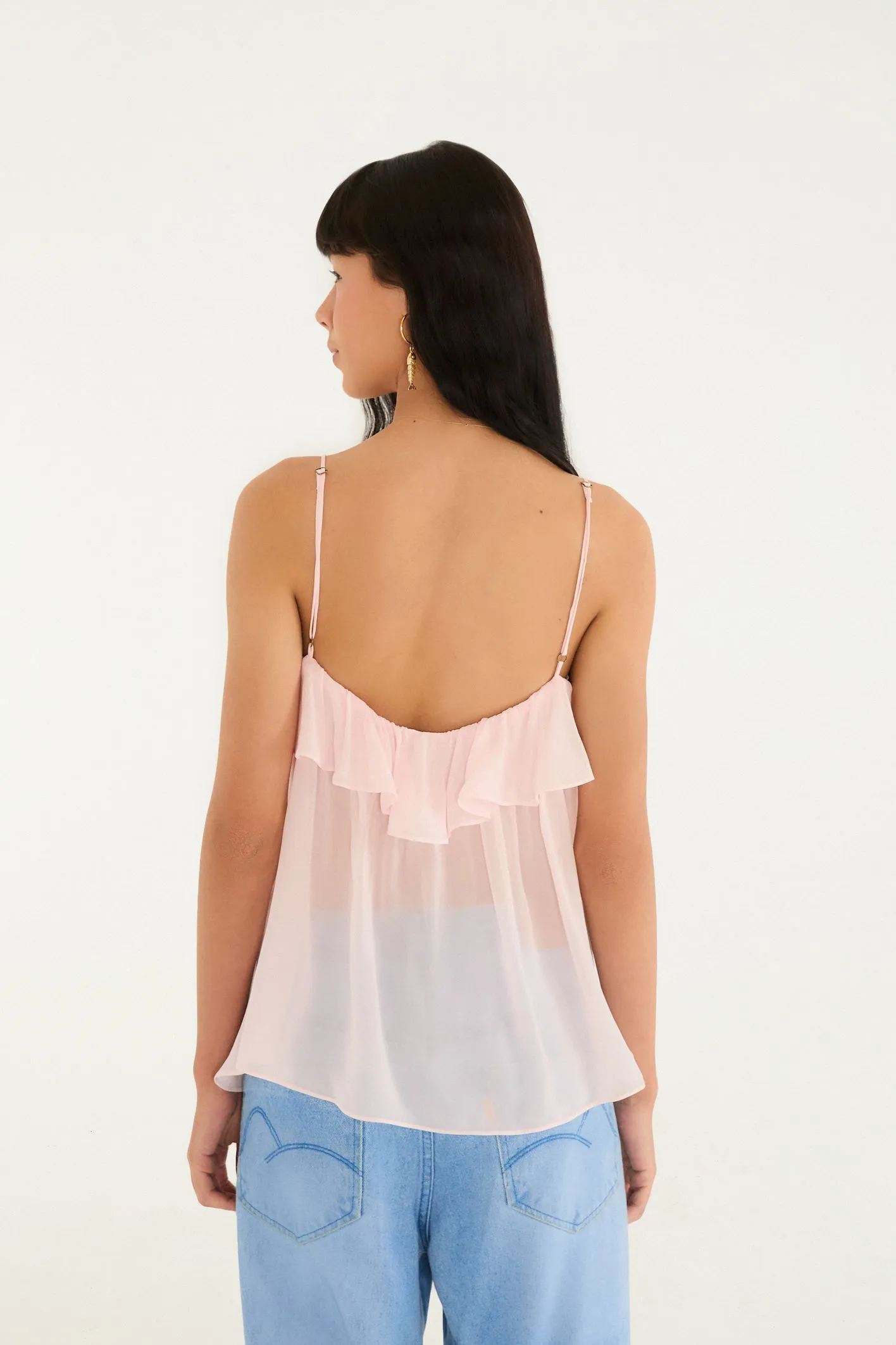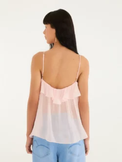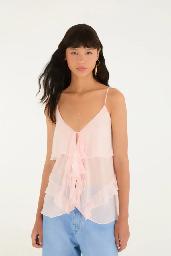 blusa alcinhas lurex. um toque de brilho para suas produções, com alças finas que se ajustam suavemente. o decote em v proporciona um charme especial, enquanto os babados em camadas adicionam movimento e leveza à peça. perfeita para um encontro casual ou passeio ao ar livre.