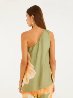 blusa amarilis. modelagem assimétrica com alça única traz modernidade e frescor ao look. o tecido leve proporciona movimento e conforto para o dia a dia ou ocasiões especiais. a estampa exclusiva eleva o visual, tornando cada momento único. versátil, é a peça-chave para combinar com diferentes estilos.