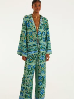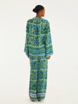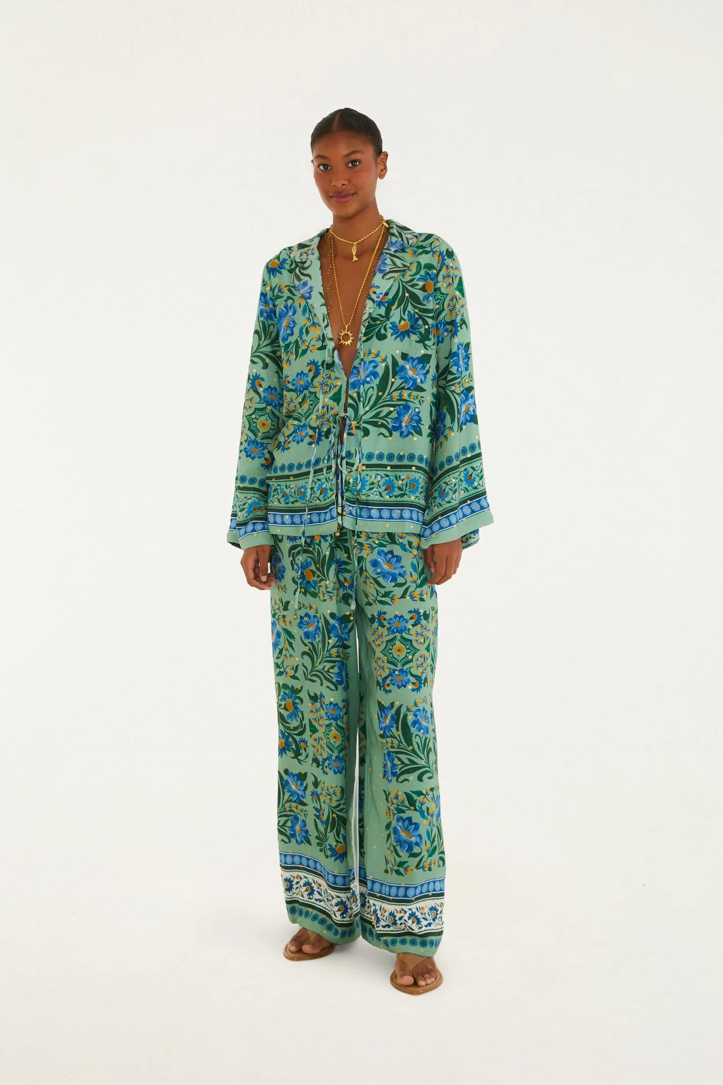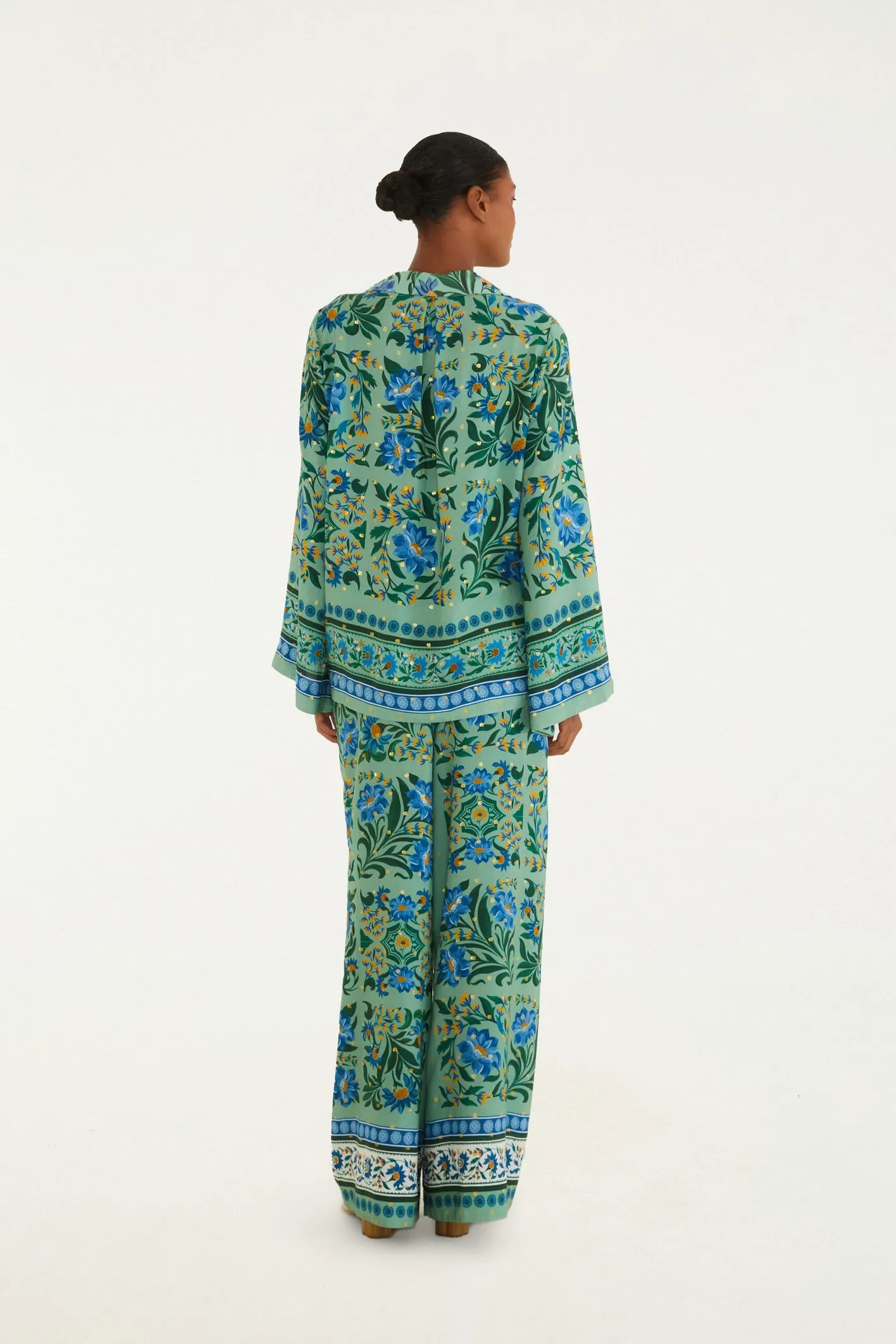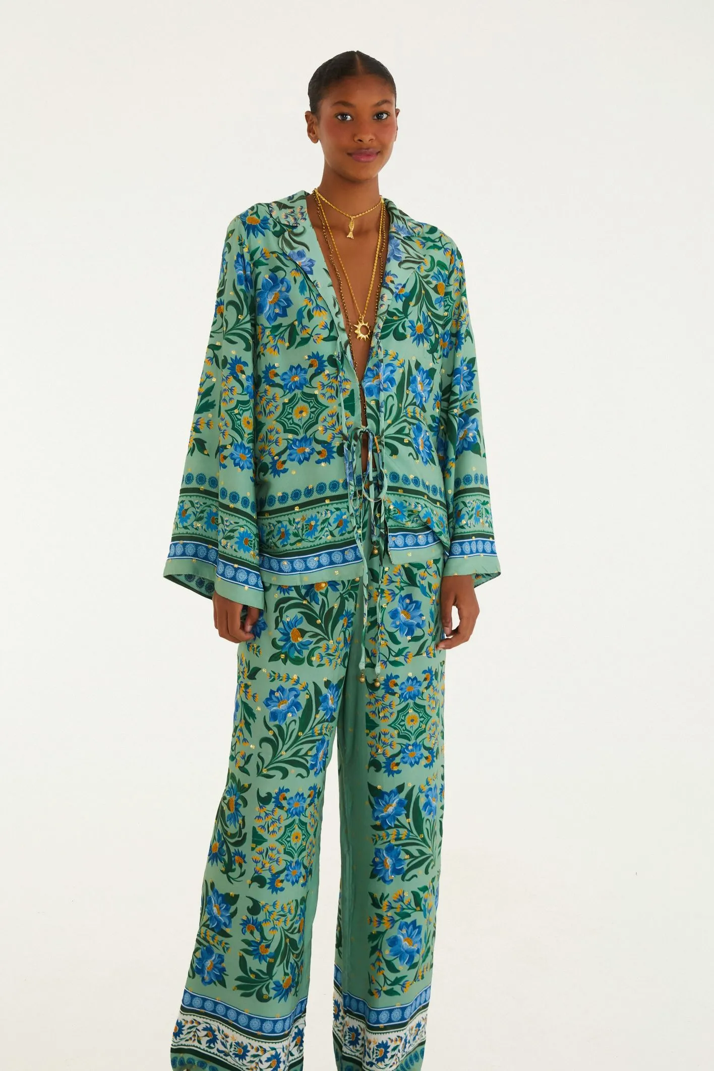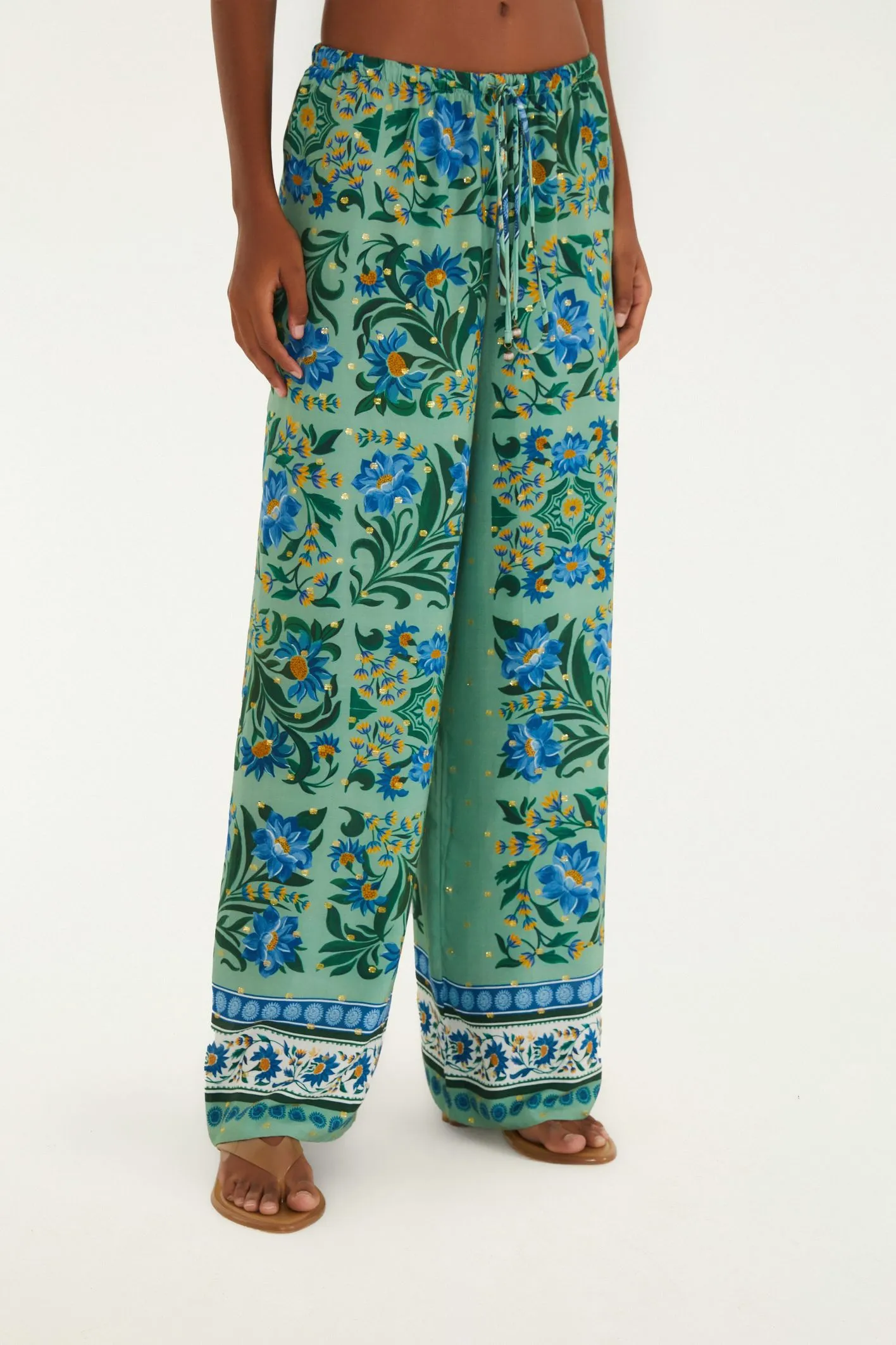 calça estampada azulejo florido. modelagem ampla que proporciona conforto e liberdade de movimento, cintura alta com fechamento por botão e zíper. o tecido suave e fluido cria um efeito leve e elegante, perfeito para um look casual ou uma ocasião especial.