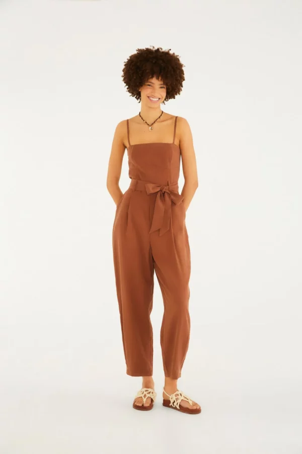 macacão alfaiataria. com alças finas e decote reto, o macacão valoriza a silhueta de forma sutil. a cintura ajustada com cinto de amarração e a calça de corte reto completam a modelagem elegante e prática. perfeito para um dia no escritório ou um jantar casual. FARM Rio, coleção Carioca – in