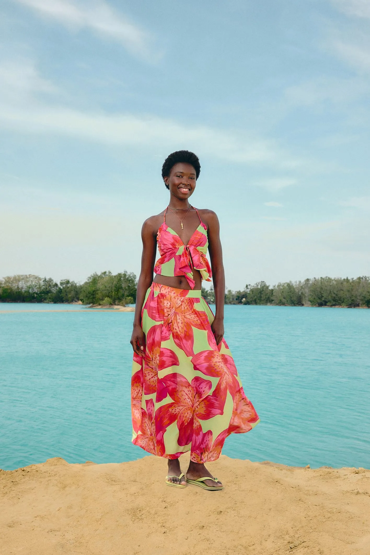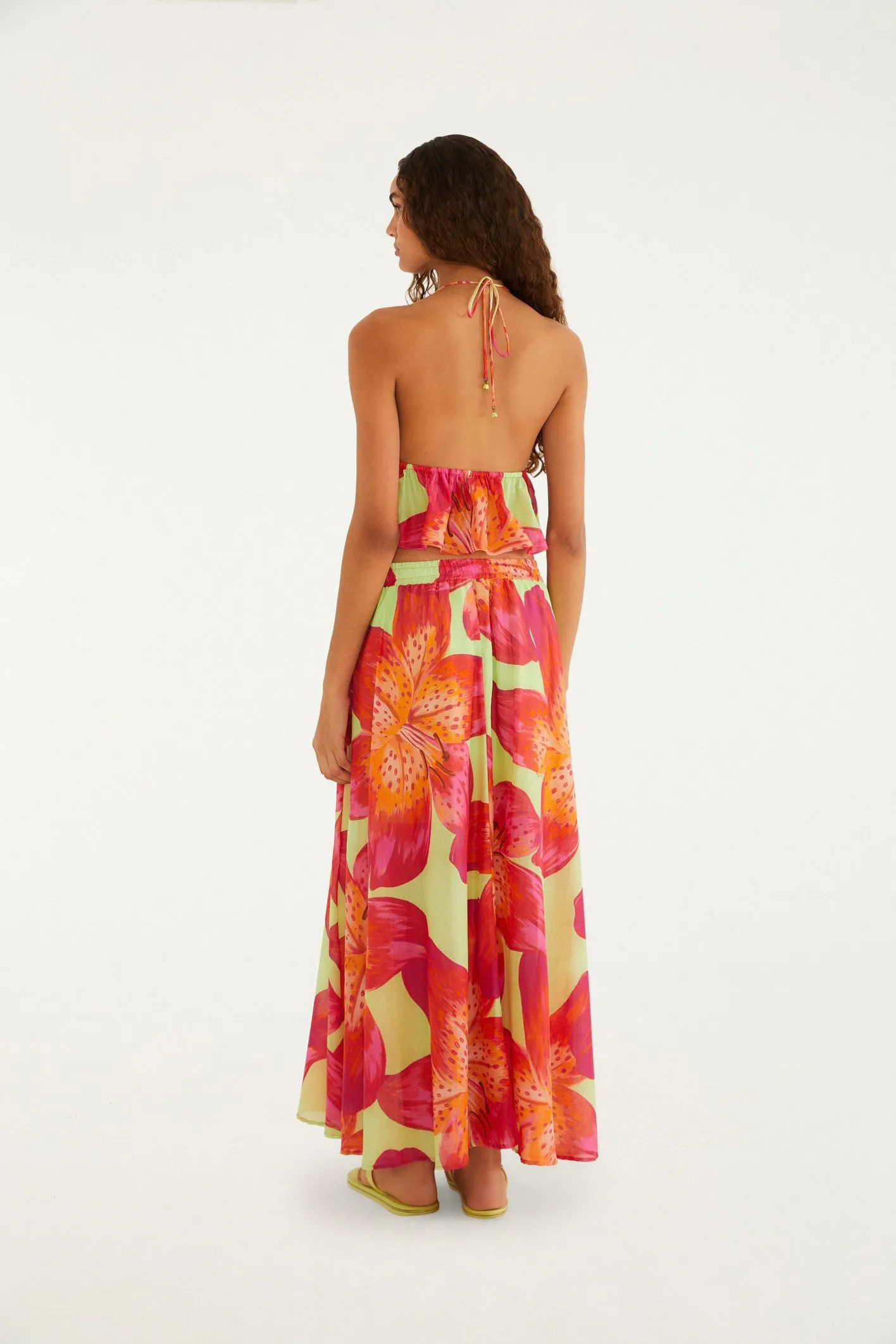 saia estampada lírio tropical. com cintura alta e corte fluido, essa peça traz alças finas ajustáveis e um caimento leve, perfeito para dias ensolarados. os detalhes do tecido elevam o charme, garantindo um toque especial para passeios ou eventos casuais. um item indispensável para compor looks frescos e autênticos.