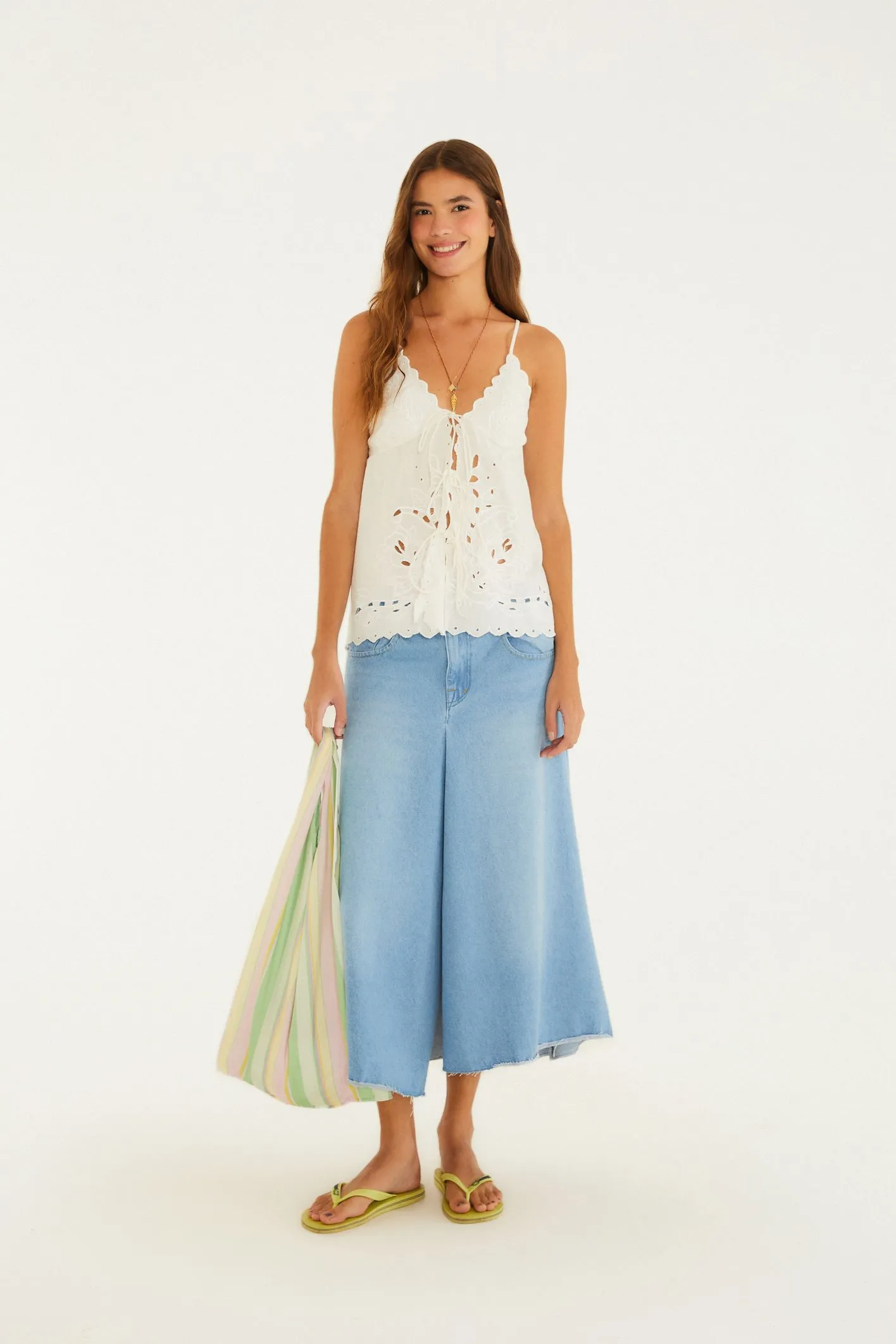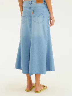 saia jeans cropped. apresenta cintura alta e corte evasê, trazendo leveza e movimento a cada passo. os acabamentos desfiados na barra adicionam um toque casual e moderno. perfeita para combinar com blusas fluidas. um convite ao estilo e versatilidade no seu guarda-roupa.