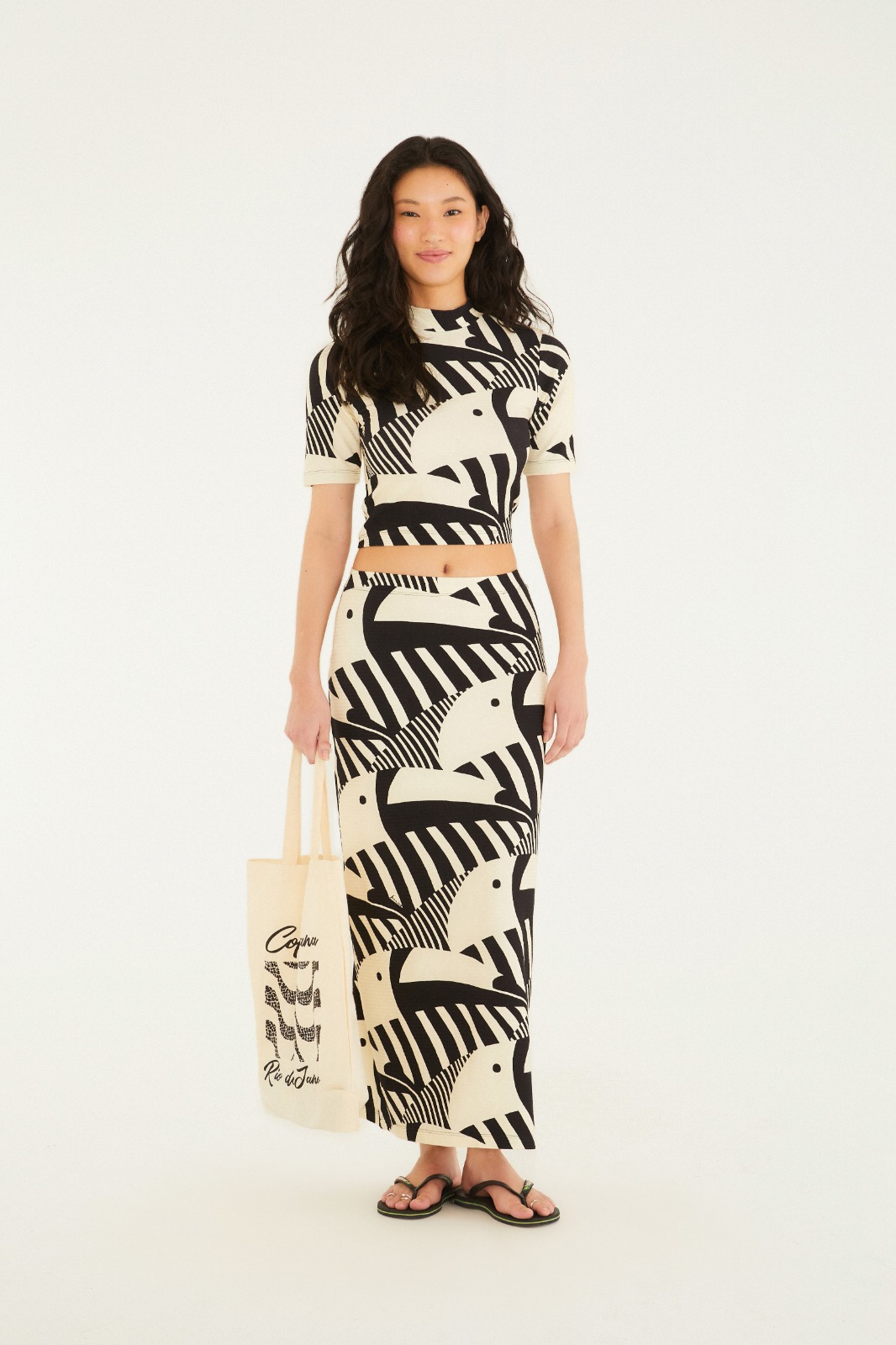 A saia midi reta tuca legal é confeccionada em tecido leve com acabamento canelado e baixa elasticidade. A peça solta ao corpo possui cintura alta, cós elástico, estampa figurativa em cor contrastante e comprimento midi.