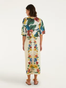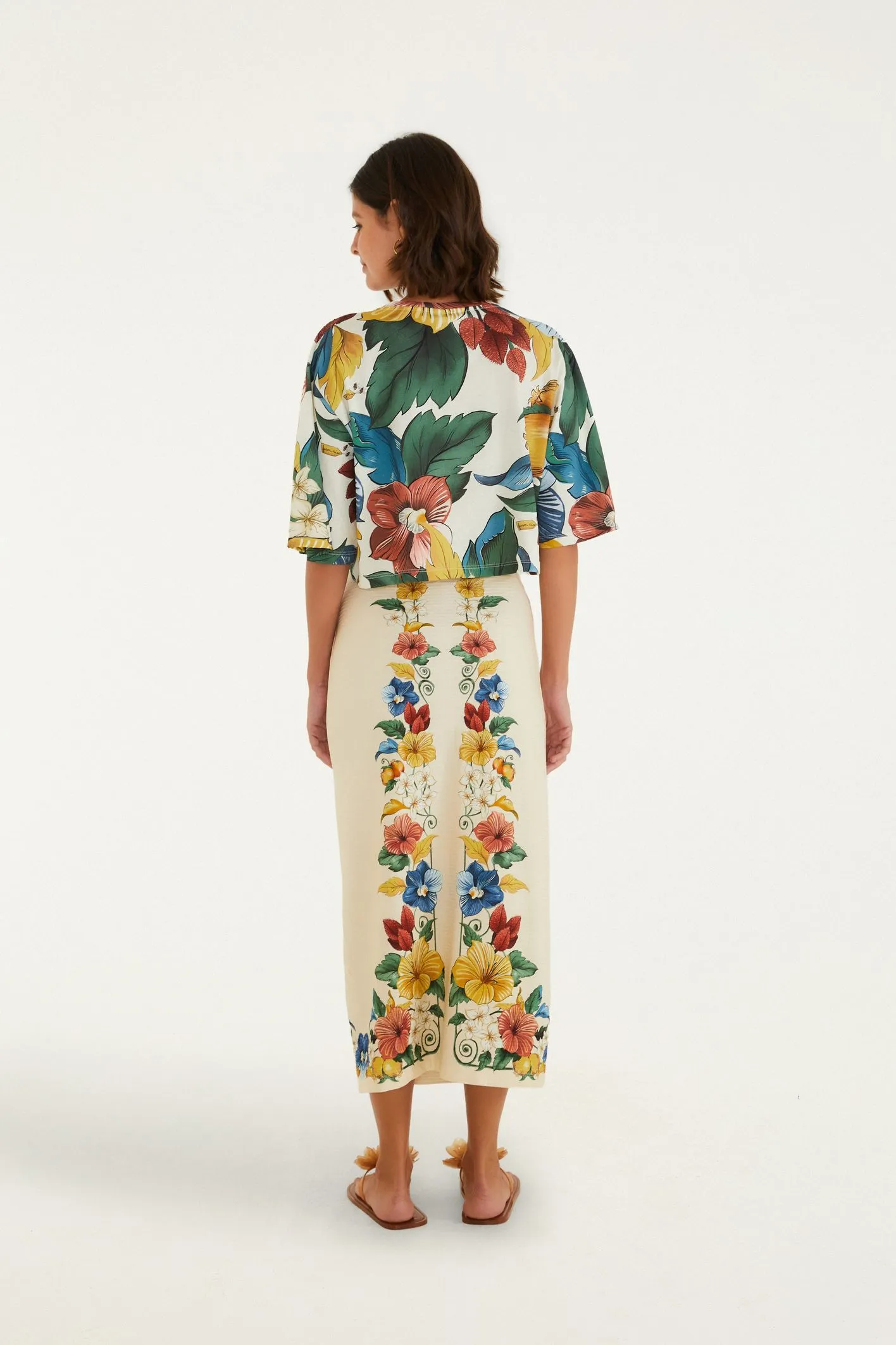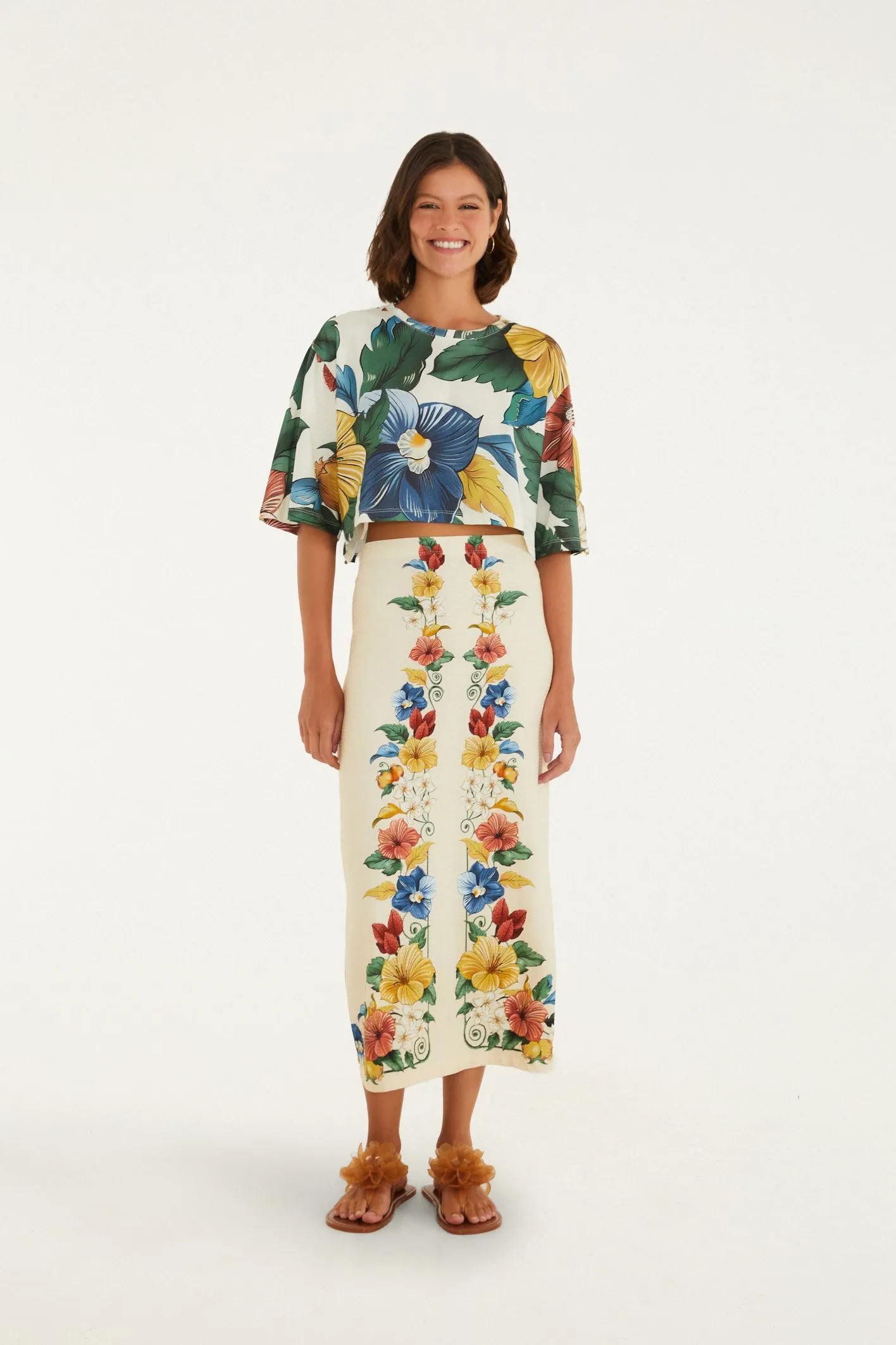 Farm Saia Reta Midi Estampado Tropicalzinho Lenço