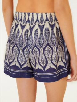 O short azul é confeccionado em tecido leve sem elasticidade. A peça solta ao corpo possui cintura alta, cós com elástico embutido, bolsos laterais e mix de estampas em cor contrastante.