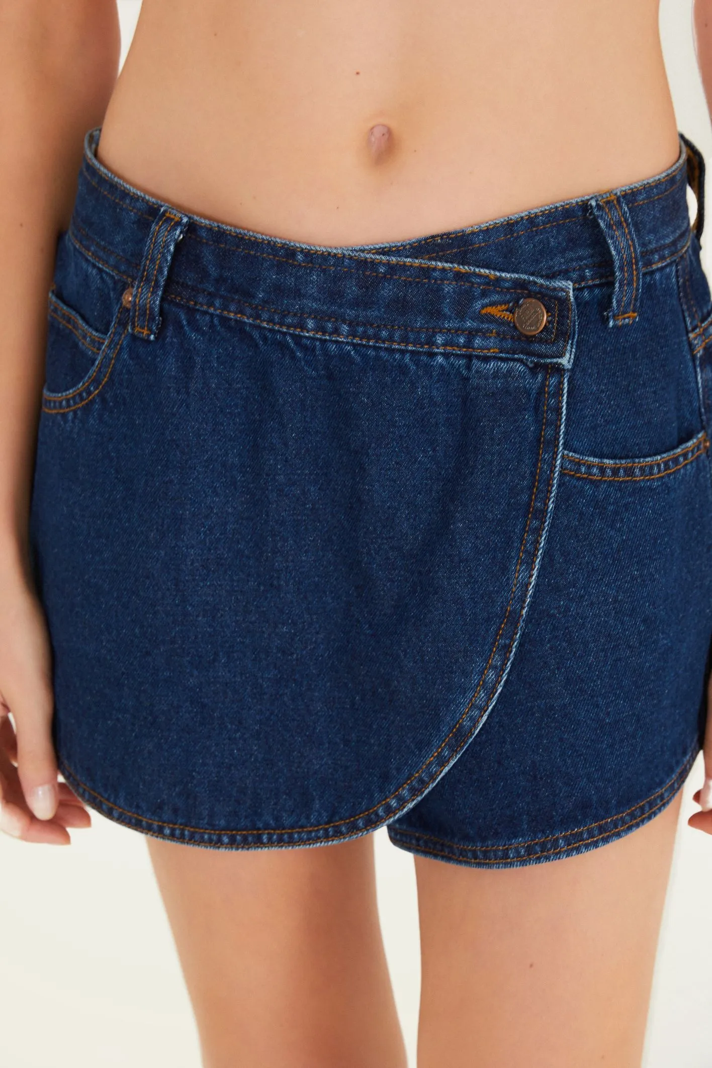 short saia jeans curva. combina o visual moderno do shorts com a elegância do corte em saia, criando uma peça única e versátil. a cintura alta e a barra curva proporcionam um movimento leve e descontraído. perfeito para um passeio no parque ou um brunch. uma peça que transforma qualquer look casual com originalidade.