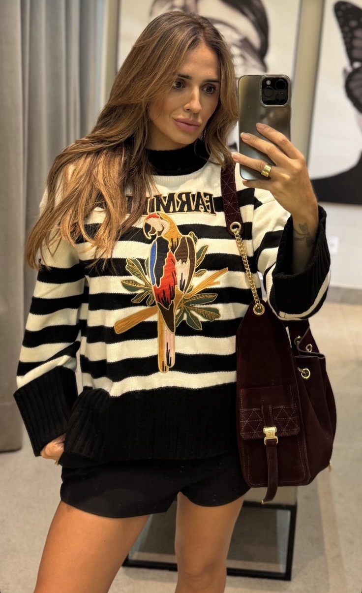 A peça solta ao corpo possui gola alta, mangas longas, ombros estendidos, bordado figurativo aplicado em cores contrastantes na parte frontal e padronagem listrada em cor contrastante.