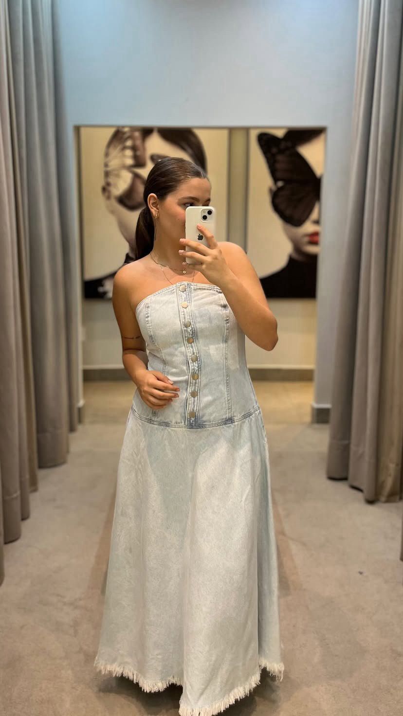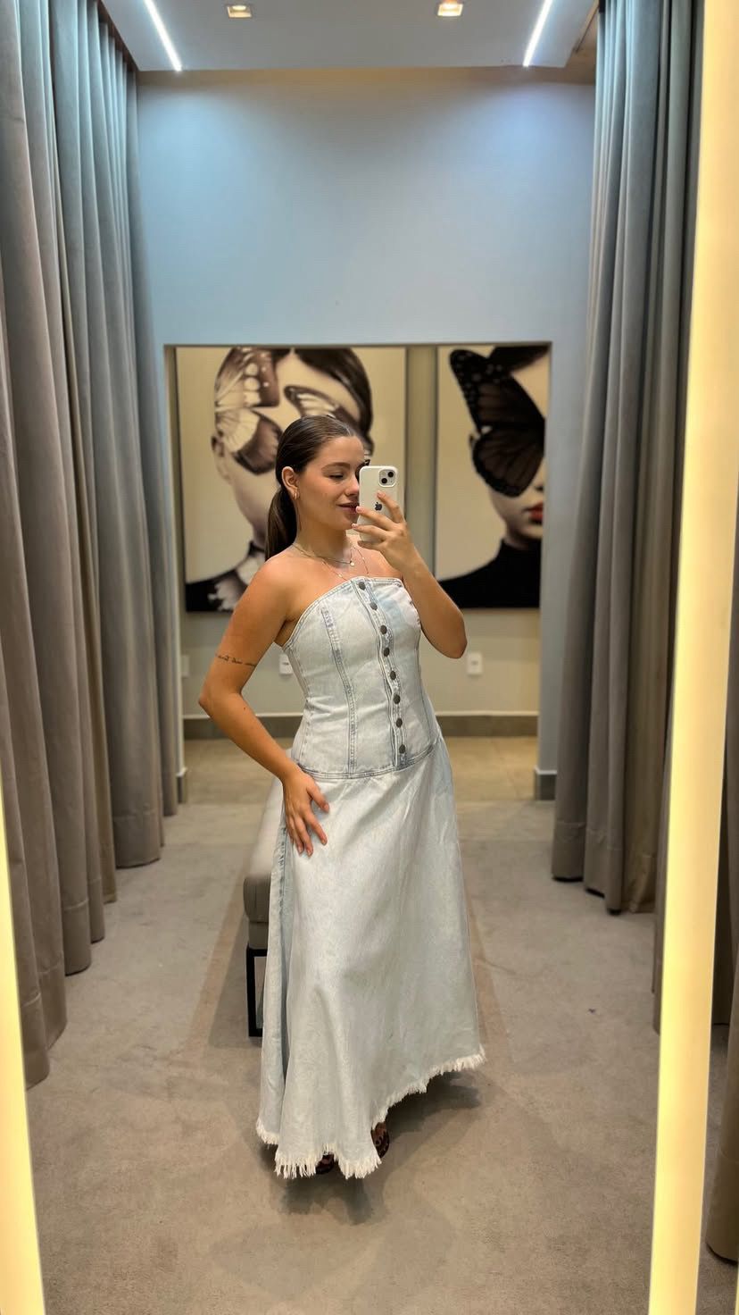O vestido azul é confeccionado em sarja com lavagem jeans sem elasticidade. A peça justa ao busto e solta ao corpo, de modelo tomara que caia, possui decote reto, recortes frontais e posteriores, cintura deslocada, lastex aplicado na parte posterior, barra desfiada, comprimento midi, forro superior e fechamento frontal por botões metálicos.