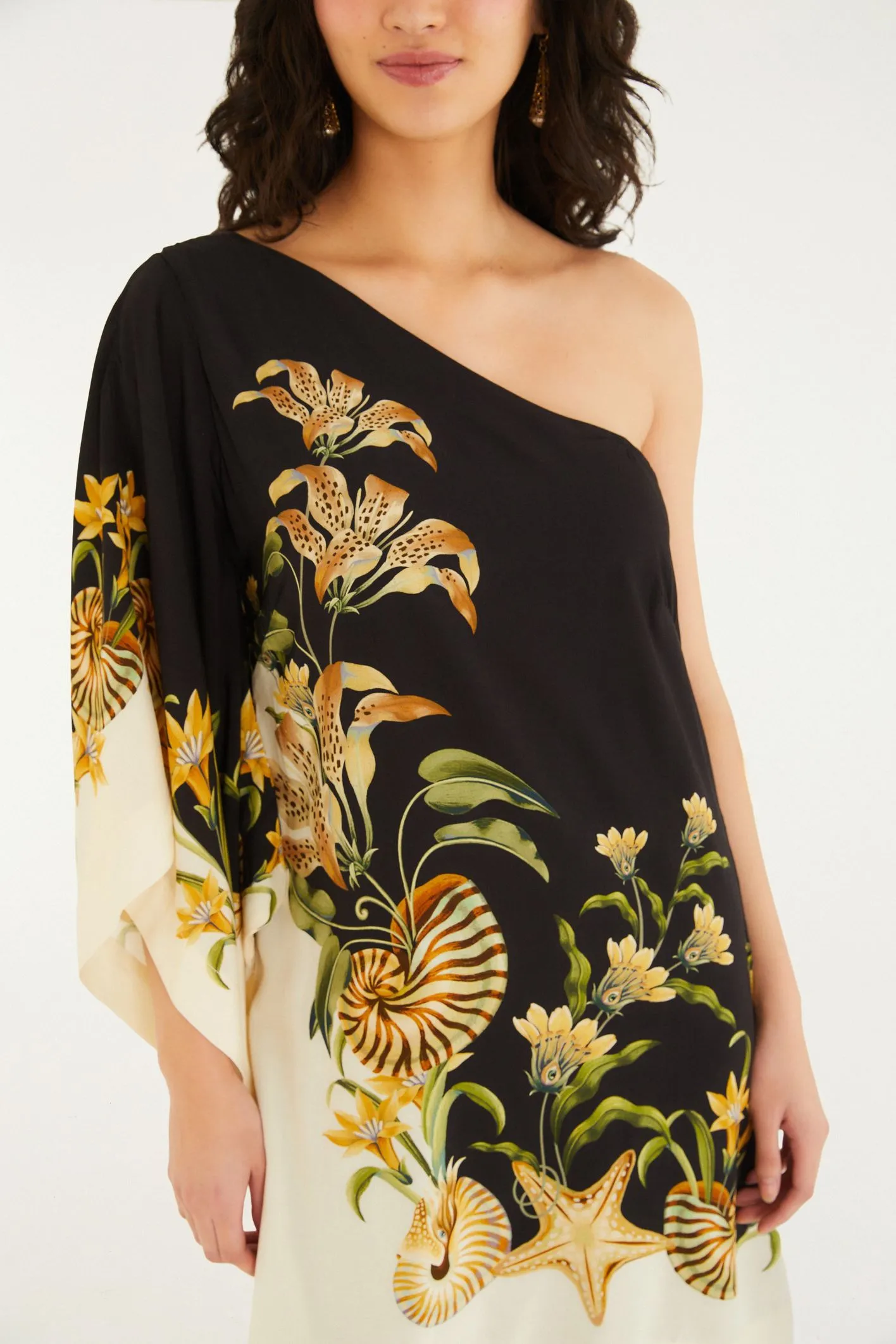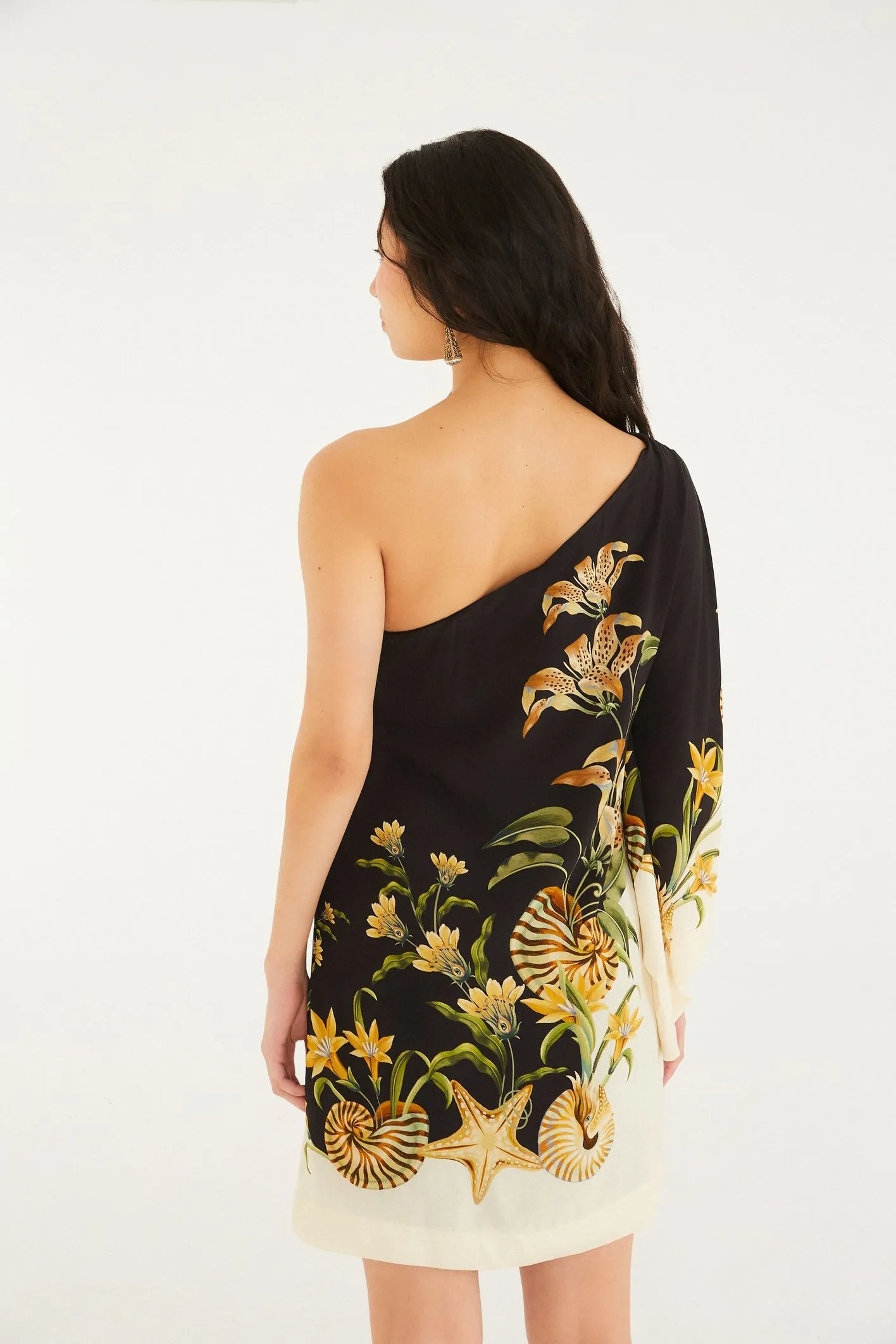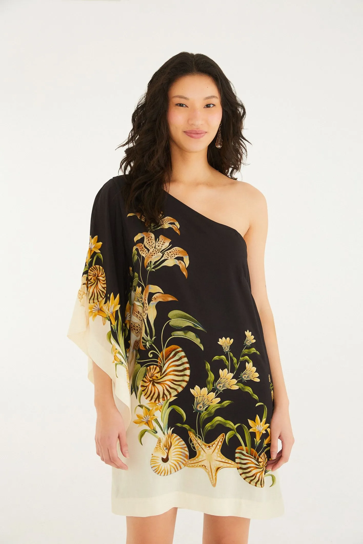 vestido ombro só concha surreal. com modelagem solta e um ombro à mostra, esta peça traz um toque leve e casual para o seu dia. perfeito para um encontro ou passeio no fim de semana, sua manga única e o acabamento suave adicionam personalidade e charme.