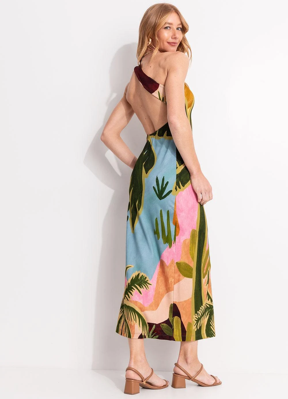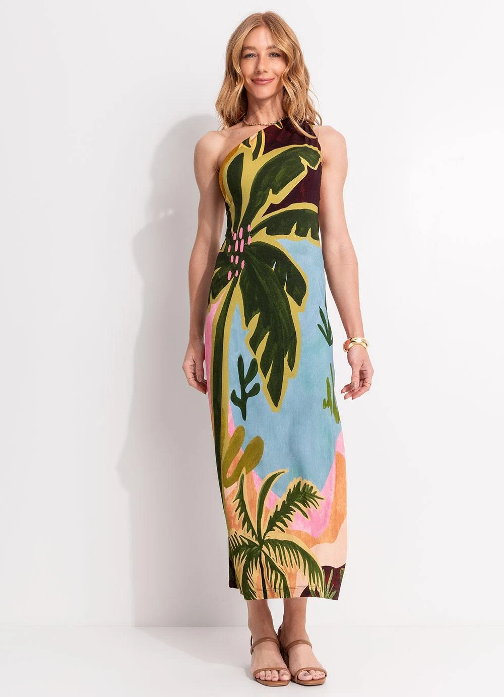 Vestido longo em malha de viscose com elastano. Modelo tubinho de um ombro só, com elástico nas costas para melhor ajuste. Recorte vazado na lateral e fenda que trazem sensualidade e movimento ao look. Ideal para produções modernas e marcantes.