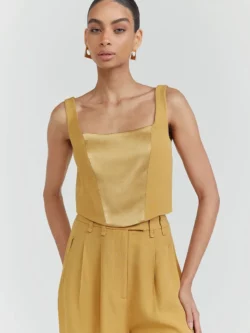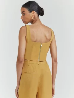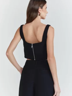 Confeccionado em alfaiataria, o top possui modelagem slim e comprimento curto. Com alças e decote reto, apresenta fechamento posterior com zíper destacável e barra invisível, proporcionando um caimento estruturado e sofisticado para composições elegantes.