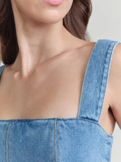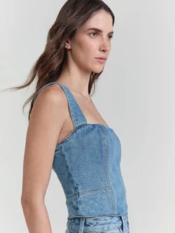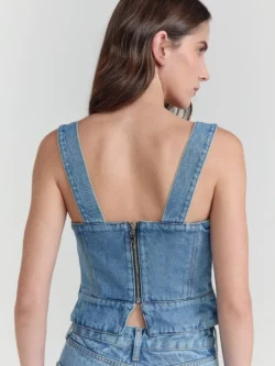 Top confeccionado em jeans com modelagem regular e comprimento tradicional. Possui alças largas, decote reto, barra arredondada e fechamento com zíper nas costas. Com lavagem exclusiva e estrutura marcante, é a escolha ideal para composições modernas e femininas.