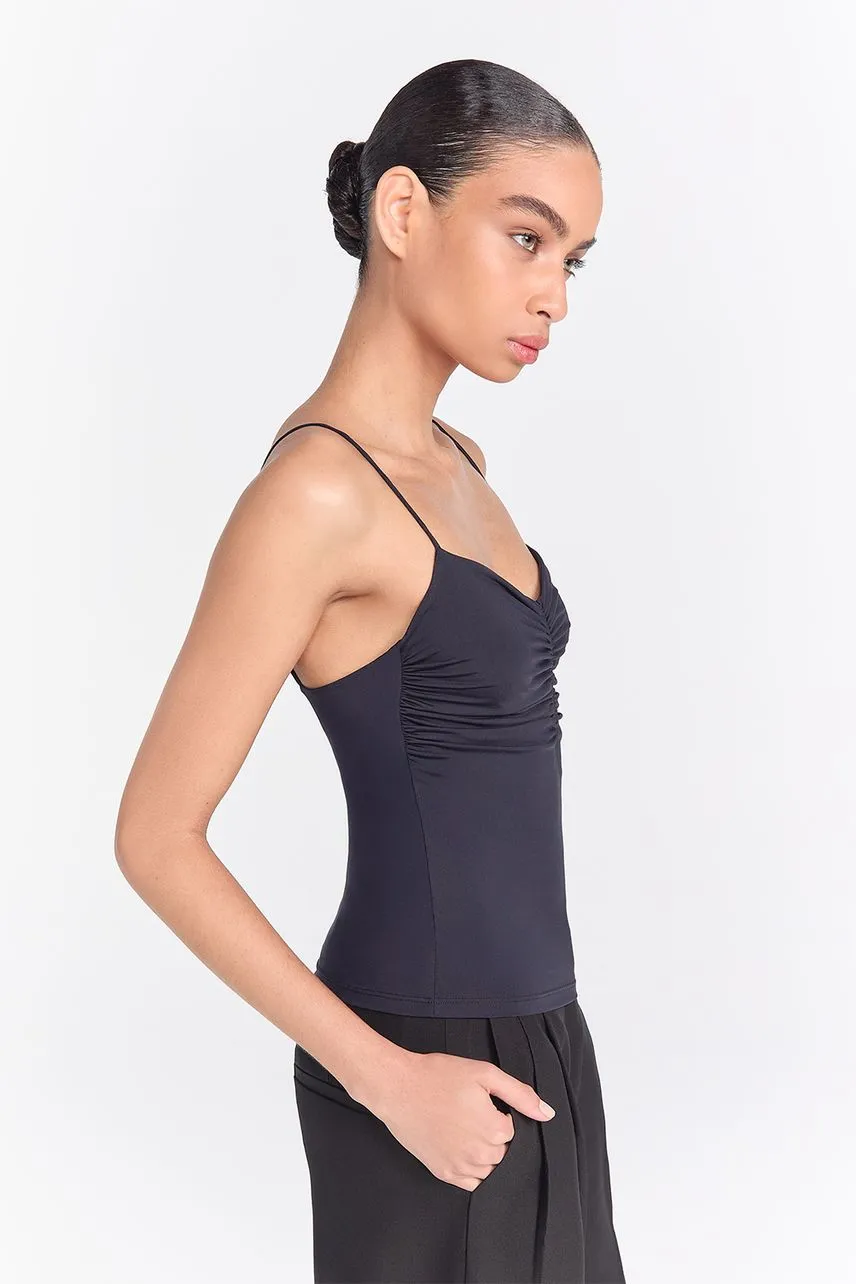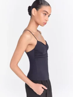 Blusa confeccionada em malha, com modelagem slim e comprimento regular. A peça sem estampa apresenta alças finas e decote princesa com detalhe drapeado, garantindo feminilidade e versatilidade para composições elegantes e modernas.