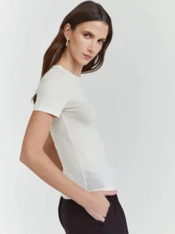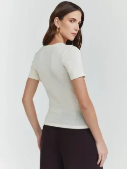 Confeccionada em tricot, a blusa de manga curta com modelagem slim e comprimento regular. Sem estampa, conta com gola careca e visual atemporal, ideal para composições versáteis.