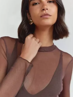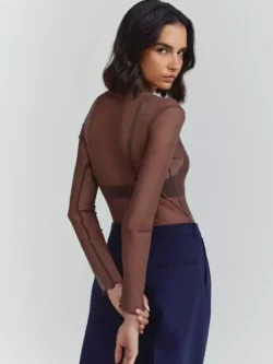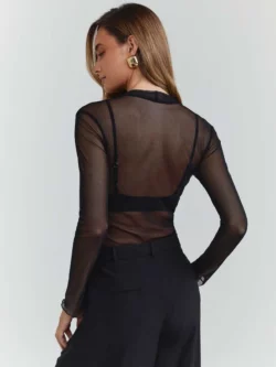 Body confeccionado em tule com modelagem slim. Possui manga longa e gola alta. Sensual e sofisticado, é ideal para sobreposições marcantes ou composições noturnas com transparência sutil e elegância.