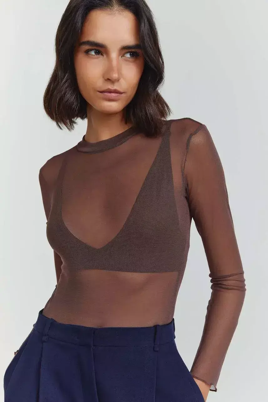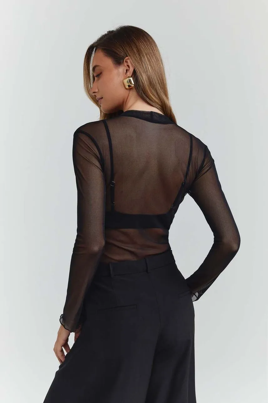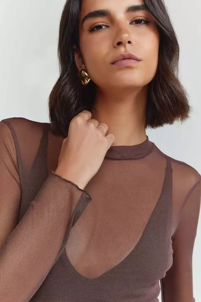 Body confeccionado em tule com modelagem slim. Possui manga longa e gola alta. Sensual e sofisticado, é ideal para sobreposições marcantes ou composições noturnas com transparência sutil e elegância.