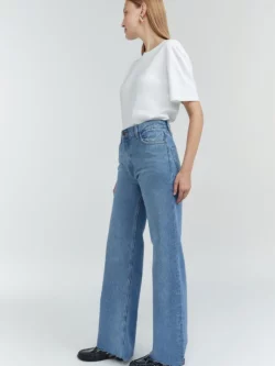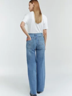 Calça jeans com modelagem reta, cintura média e comprimento longo. Possui cós reto, bolsos frontais e bolso relógio. Com fechamento em botão e zíper de metal, lavagem e barra a fio, é uma peça versátil para composições atemporais.