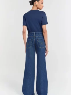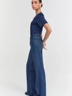 Calça jeans com modelagem reta, cintura média e comprimento longo. Possui cós reto, bolsos frontais e bolso relógio. Com fechamento em botão e zíper de metal, lavagem e barra a fio, é uma peça versátil para composições atemporais.