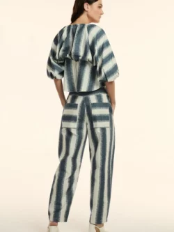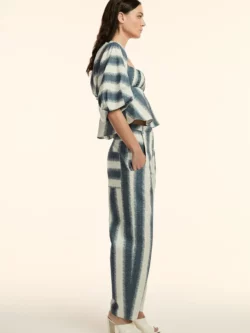 A calça Joyce barrel de linho une conforto e elegância em um design moderno. Com padronagem de listras e cintura média, o fechamento frontal com zíper e botão interno garante um caimento impecável, enquanto os bolsos funcionais adicionam praticidade ao look.