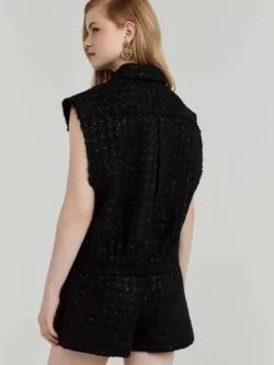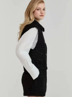 Colete confeccionado em tweed, com modelagem e comprimento regulares, trazendo um visual contemporâneo com toque clássico. A textura do tecido confere sofisticação à peça, enquanto o design sem mangas e a gola regular garantem versatilidade no uso. Possui fechamento com botão de pressão e zíper de metal, barra com elástico embutido e bolso com lapela, resultando em um modelo funcional e cheio de informação de moda, ideal para composições modernas e elegantes.