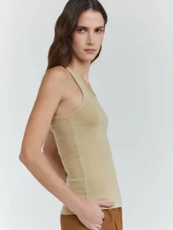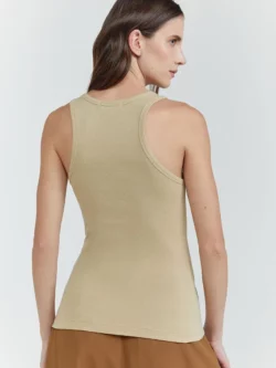 Regata confeccionada em malha de algodão com modelagem slip e comprimento regular. Possui decote U e barra reta, criando uma silhueta ajustada. Essencial no closet, combina conforto com estilo casual e atemporal.