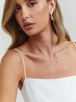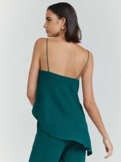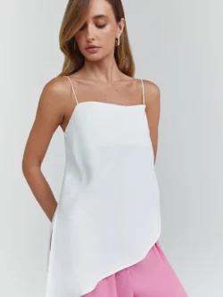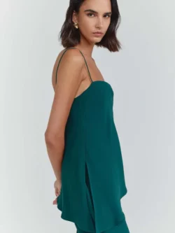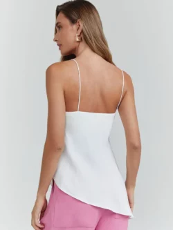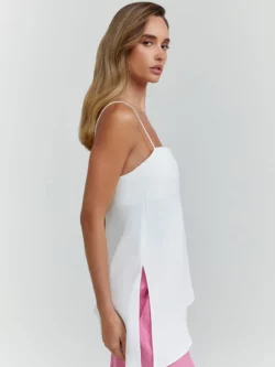 Blusa confeccionada em crepe alfaiataria, com modelagem slip e comprimento midi. A peça sem estampa possui alças finas, decote reto e fechamento lateral com zíper invisível. O destaque fica por conta da barra assimétrica com fenda, que adiciona leveza e modernidade à silhueta.