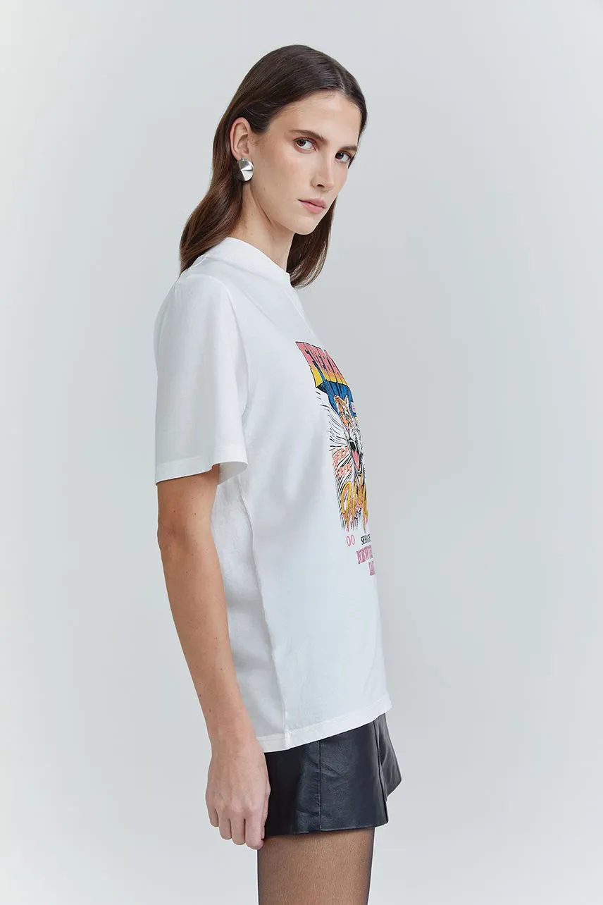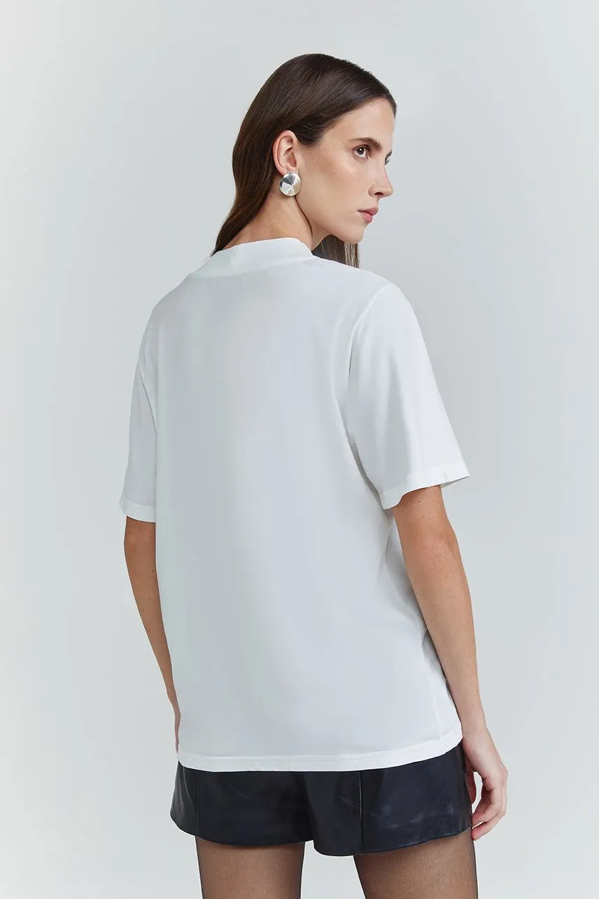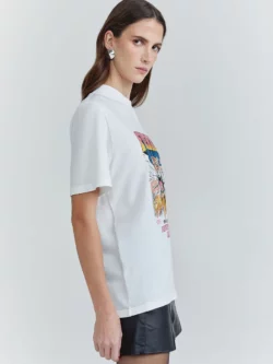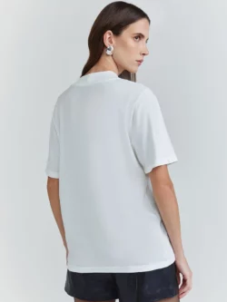 Confeccionado em malha, o modelo traz shape oversized e comprimento longo. O silk frontal imprime personalidade à peça, enquanto a manga curta, o decote canoa e a barra reta garantem equilíbrio entre conforto e estilo contemporâneo.