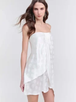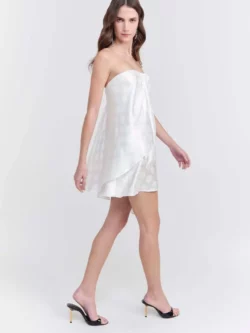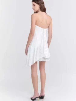 Vestido confeccionado em jacquard fluido, com modelagem assimétrica e comprimento curto. Sem alça e sem manga, possui fechamento posterior com zíper invisível. Conta com barra assimétrica, pregas e drapeado que valorizam o caimento.