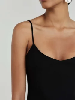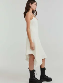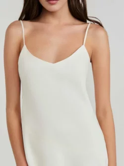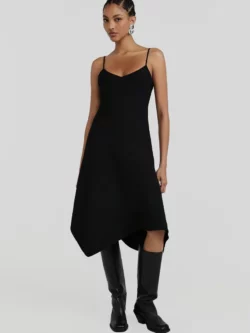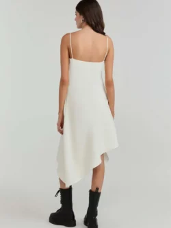 Vestido confeccionado em crepe de alfaiataria, com modelagem reta e comprimento midi. Possui alças delicadas e decote V que valorizam o colo, além de fechamento por zíper invisível que garante um acabamento limpo e sofisticado. A barra assimétrica acrescenta movimento e modernidade à peça, tornando-a ideal para produções elegantes que transitam com facilidade entre ocasiões diurnas e noturnas.