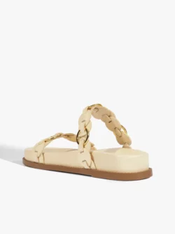 Cheia de atitude, esta sandália papete branca em couro é a escolha ideal para quem busca estilo com conforto. Com duas tiras largas no cabedal adornadas por argolas douradas, o modelo slide ganha um visual moderno e marcante que deixa qualquer look mais interessante.