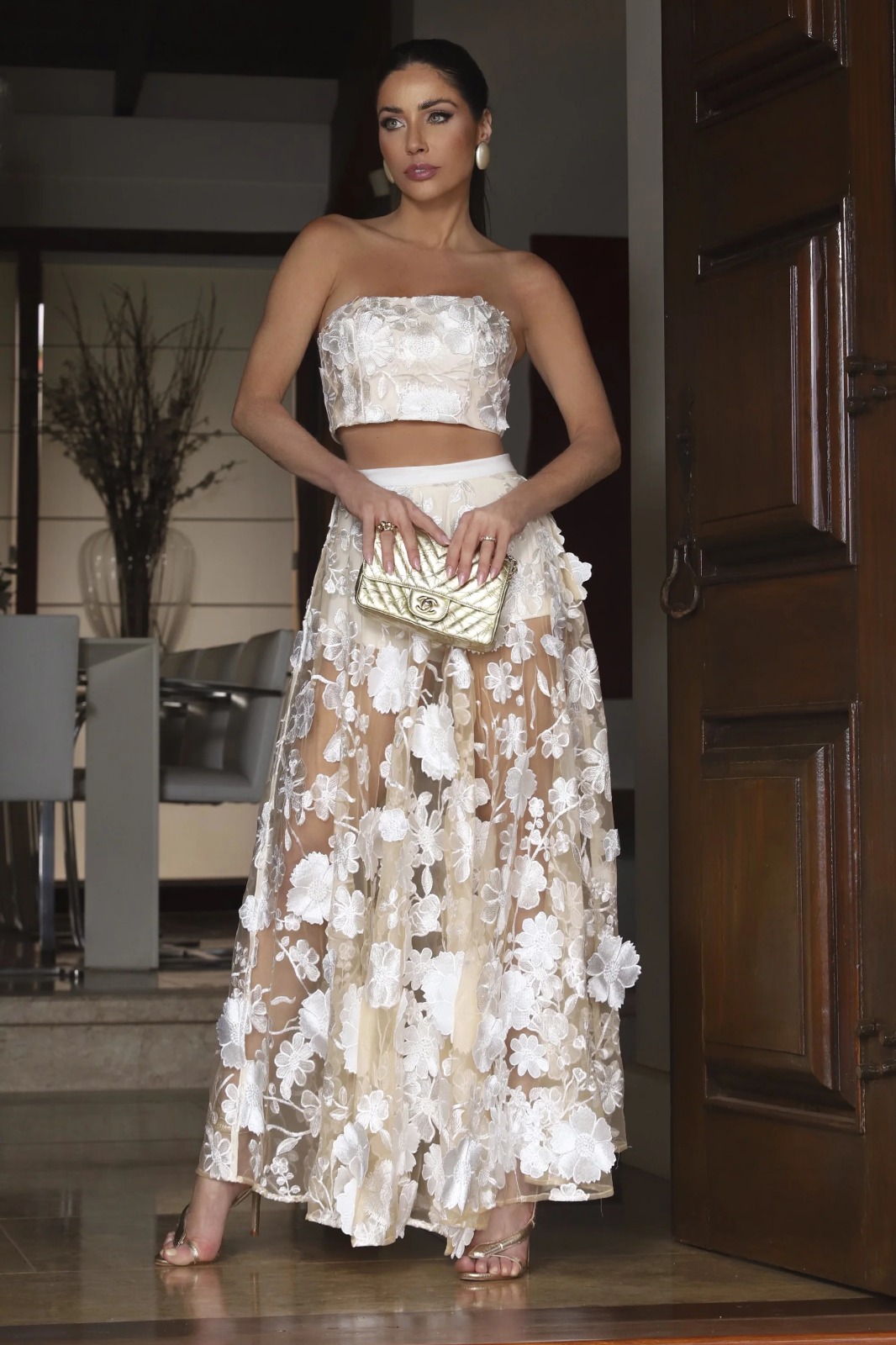 Saia confeccionada em Tule Bordado na cor Off White. Possui comprimento midi, cos medio em linho, barra ampla, fechamento em zíper, acompanha shorts de malha na cor.
