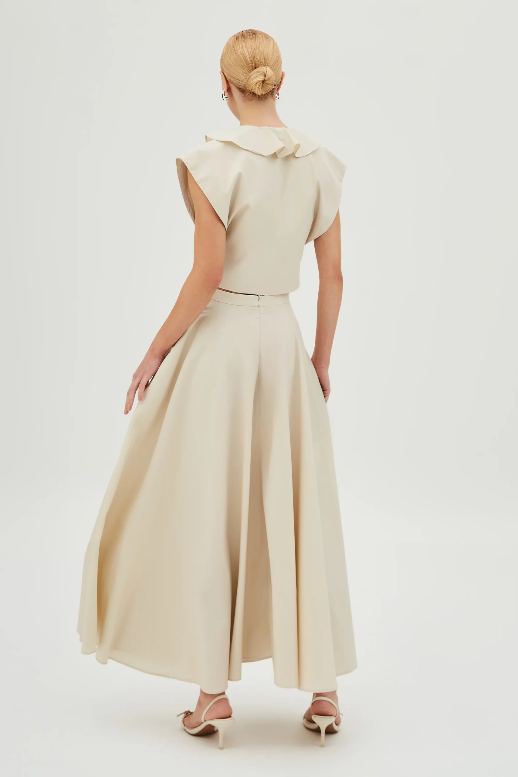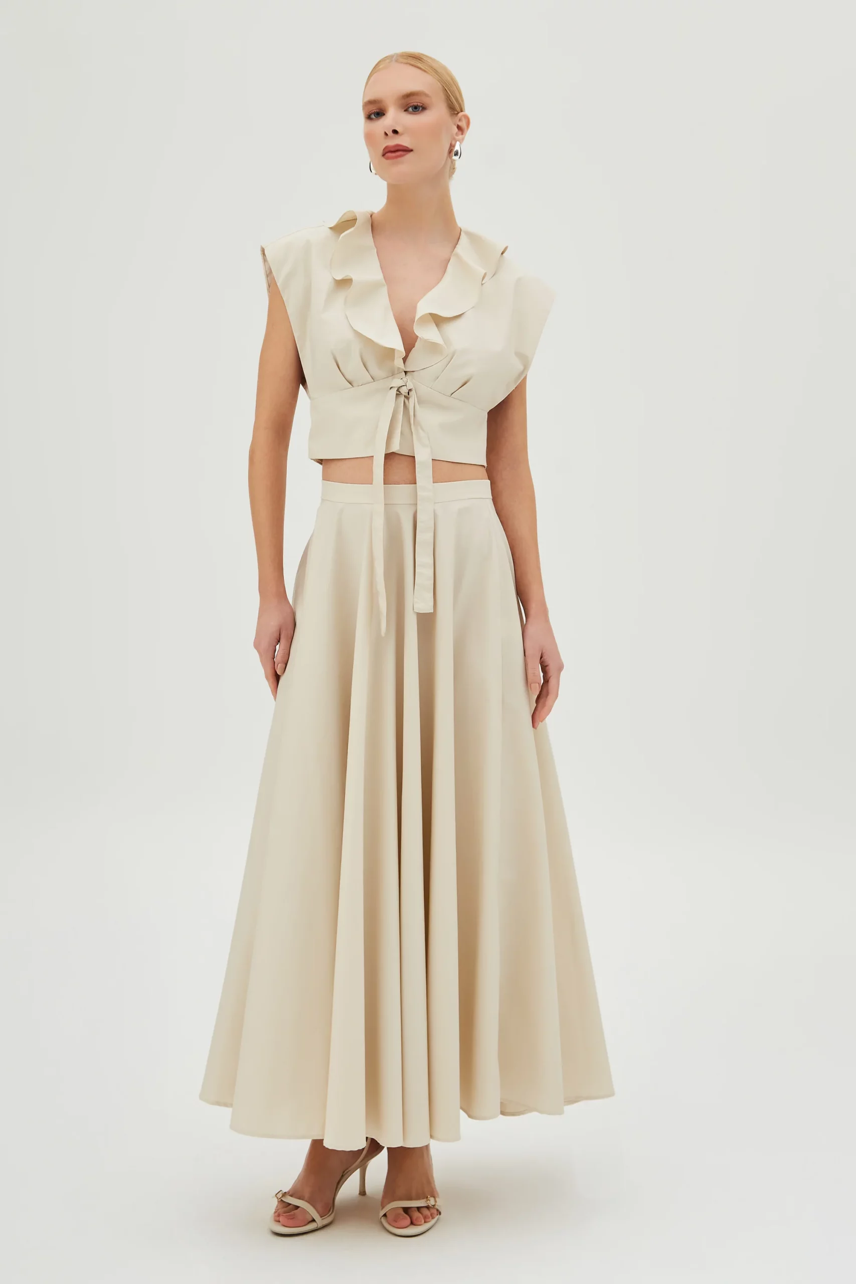 Saia confeccionada em Compact Cotton na cor Areia. Possui comprimento midi, caimento acinturada, rodada ampla.