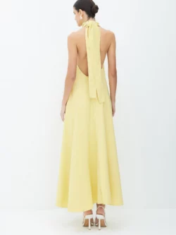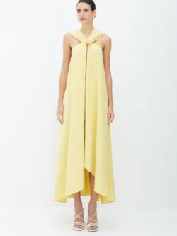 Tunica confeccionada em Viscose Lyocell na cor Amarelo Manteiga. Peça fluida e ampla ao corpo, com ajuste por amarração no pescoço e fechamento por zíper invisível nas costas.