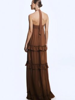 Zen VESTIDO LONGO COM BABADOS AMARRACAO PESCOCO MARROM CANELA