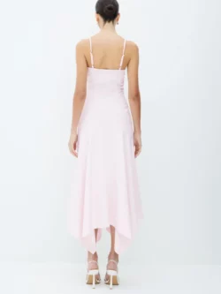 Vestido confeccionado em Malha de Viscose na cor Rosa Celestial. A peça possui comprimento midi, caimento ajustado ao corpo, franzido lateral, barra assimétrica, alça ajustável.